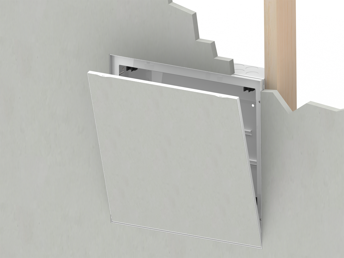 Vi visar Thermotechs nya gipsbara front som ger en näst intill osynlig installation. Fronten förses med samma material som väggkonstruktionen och monteras sedan på fördelarskåpet som därmed blir en naturlig del av övrig väggbeklädnad.