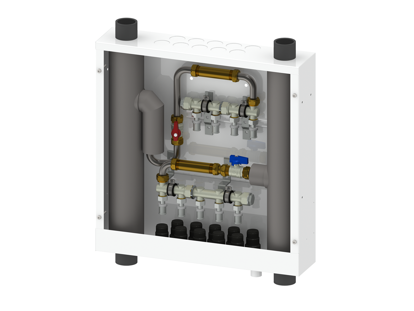 Ett prefabricerat fördelarskåp med förmonterade radiatorfördelare, kulventil, avluftningsventiler, injusteringsventil och 16 mm presskopplingar för radiatorslingor. Förberett för genomgående matning till vänster och/eller höger i skåpet. Flexibelt val av kopplingar för matarledning, upp till 32 mm.